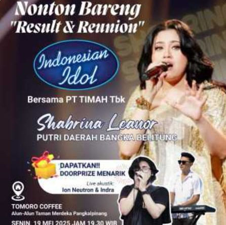 RiauKepri.com, PANGKALPINANG — Agar Shabrina Leanor jadi juara di grand final Indonesia Idol nanti malam, PT Timah Tbk gelar nonton bareng di tiga kabupaten kota yang ada di Provinsi Bangka Belitung, di antaranya Kota Pangkalpinang lokasinya di Tomoro, Kabupaten Belitung Timur lokasinya di Teras Manggar, dan di Kabupaten Bangka tepatnya di Kantor Divisi EOE PT Timah Sungaliat, yang digelar serentak Senin (19/5/2025) pukul 19.30 WIB.