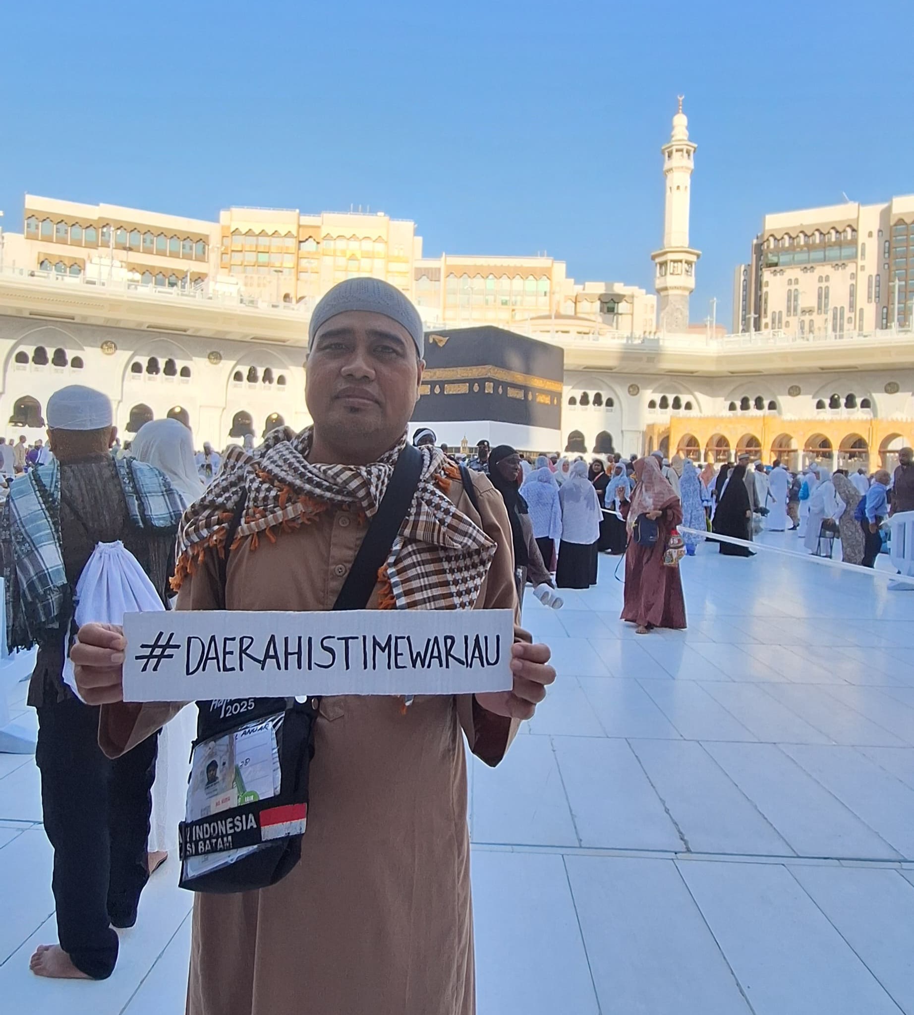 Sebagai bentuk simbolis dukungan dan doa tersebut, Syaiful mengabadikan momen di pelataran Masjidil Haram sambil memegang kertas bertuliskan #DAERAHISTIMEWARIAU.