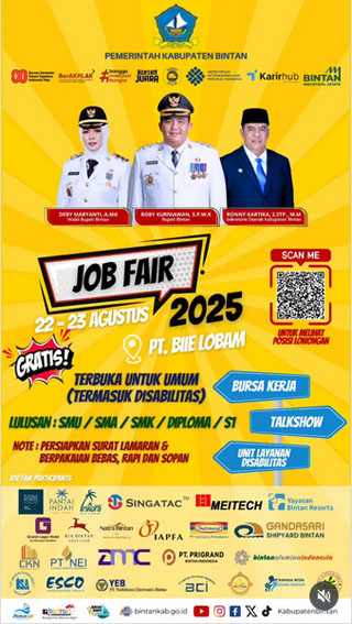 Dengan berbagai peluang dan fasilitas yang ditawarkan, Bintan Job Fair 2025 diyakini akan menjadi ajang yang ditunggu-tunggu para pencari kerja di Kepulauan Riau dan sekitarnya. Jangan lewatkan kesempatan emas ini, siapkan dirimu, dan raih karier impianmu! (RK9)