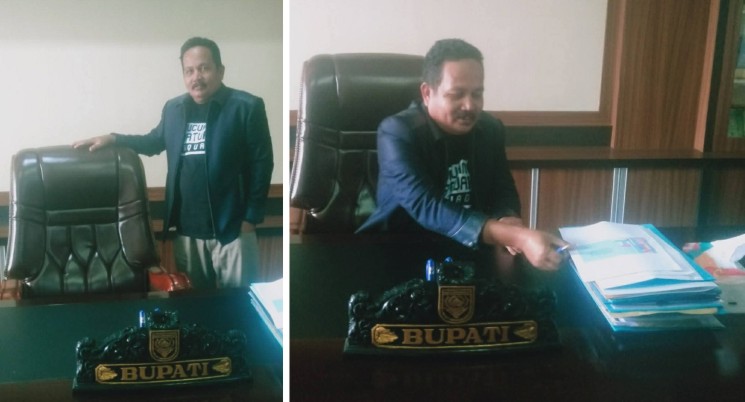Bagaimana ini bisa terjadi? Saya diajak sang bupati bertandang ke kantornya di kompleks perkantoran bupati di Sungai Jering. Sesampai di kantor, saya disuruh sang bupati duduk di kursi kerjanya.