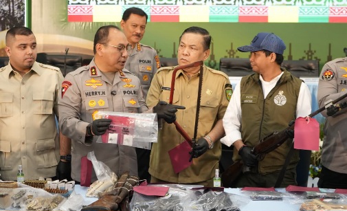 Polisi menyita enam gading gajah, senjata api rakitan beserta amunisi, tengkorak dan rahang gajah. Tak hanya itu, ratusan kilogram sisik trenggiling serta taring dan kuku harimau sumatera turut diamankan.