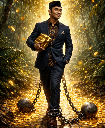 Inilah bahaya emas, Wak. Secara falsafah, emas memang barang aneh. Di satu sisi dia lambang kemurnian, berkilau, berkinyau, tahan karat, tak lapuk dek hujan tak lekang dek panas. Tapi di sisi lain, emas juga ujian paling berat bagi ego manusia.