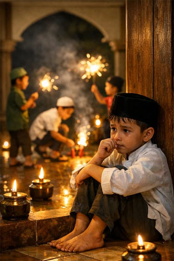 Namun pertanyaan itu terasa seperti menghantam langsung ke dadaku. “Jadi, saya harus menunggu jadi anak yatim dulu baru bisa beli kembang api dan baju baru?,” kata bocah itu.