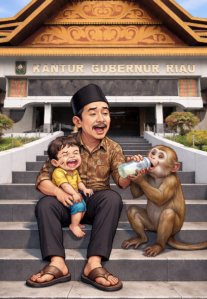 Coba kita tengok pelan-pelan kondisi Risau (maksudnya Riau). Jalan masih banyak yang goyang macam joget dangkung, sekolah ada yang atapnya bocor macam saringan santan, orang sakit masih berjele-jele tersusun. Eeh, tiba-tiba duit ratusan miliar melayang pada bukan prioritas utama. Ini bukan lagi cerita baik hati, ini sudah masuk bab “terlebih baik hati sampai lupa diri.”