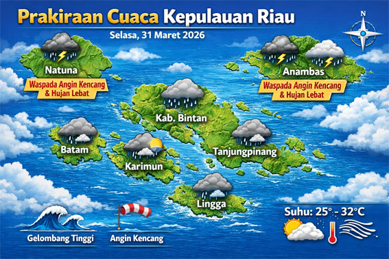 Di Kabupaten Karimun, cuaca diperkirakan berawan sepanjang hari dengan peluang hujan ringan pada siang hari. Kondisi laut relatif tenang hingga sedang.