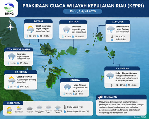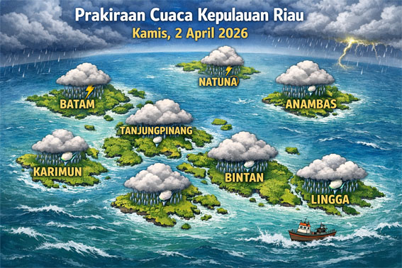 RiauKepri.com, KEPULAUAN RIAU – Prakiraan cuaca di wilayah Kepulauan Riau (Kepri) pada Kamis, 2 April 2026, didominasi kondisi berawan hingga hujan ringan di sebagian besar daerah. Masyarakat diimbau tetap waspada terhadap potensi hujan yang dapat disertai angin kencang, terutama pada siang hingga malam hari.
