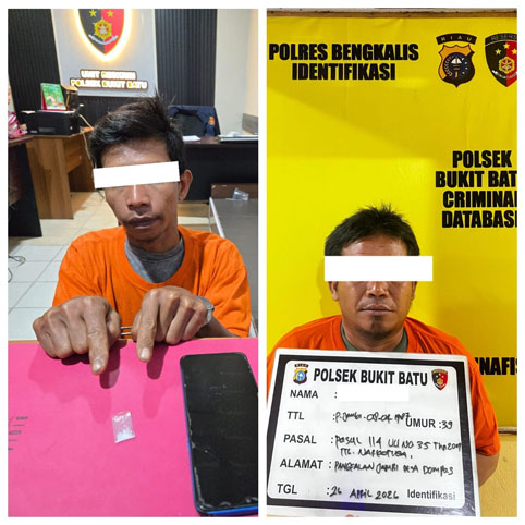 RiauKepri.com, BENGKALIS – Upaya pemberantasan narkotika terus digencarkan jajaran Polsek Bukit Batu. Pada Minggu malam, 26 April 2026 sekira pukul 20.30 WIB, tim opsnal berhasil mengungkap tindak pidana penyalahgunaan narkotika jenis sabu di wilayah Desa Teluk Belang, Kecamatan Siak Kecil, Kabupaten Bengkalis. Dalam pengungkapan tersebut, dua orang tersangka berhasil diamankan, masing-masing berinisial M.Y.A dan M.S.