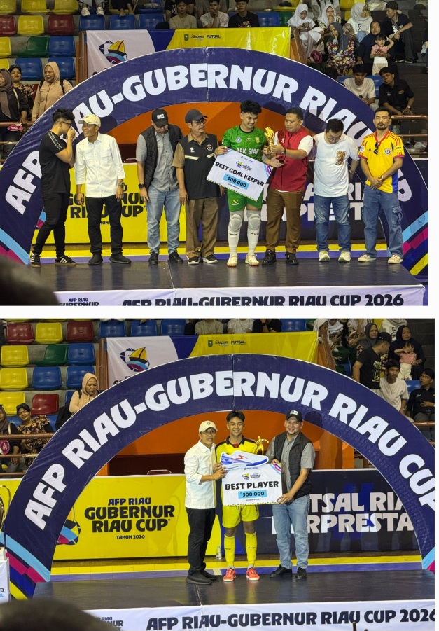 RiauKepri.com, PEKANBARU– Kabupaten Siak tampil sebagai juara pertama pada Kejuaraan Daerah (Kejurda) Futsal Gubernur Riau Cup 2026 yang berlangsung di GOR Tribuana Pekanbaru. Selain meraih gelar juara, tim Siak juga memborong sejumlah penghargaan individu.